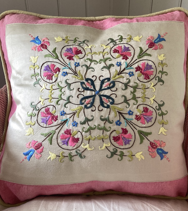 To make the cushion the embroidery was mounted on a chunky hand-dyed pink linen – piped with green/gold linen and backed with a fine quality French linen in lilac.