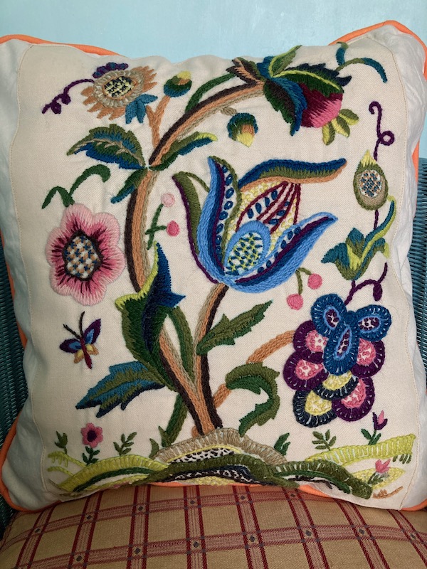 A bold statement 1980’s crewel embroidered Tree of Life panel made into a cushion with a contrasting tangerine piping and a dusky rose pink linen back.