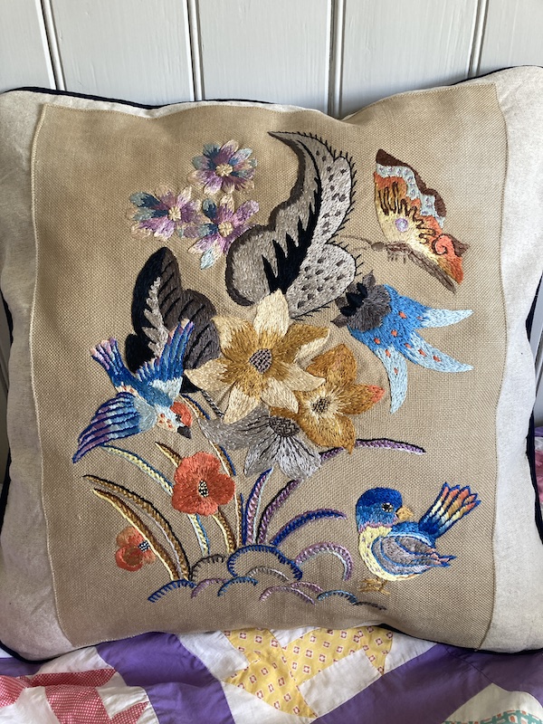 A very nice vintage embroidery on an open-weave linen ~ mounted on a Laura Ashley linen and piped with navy blue wool.