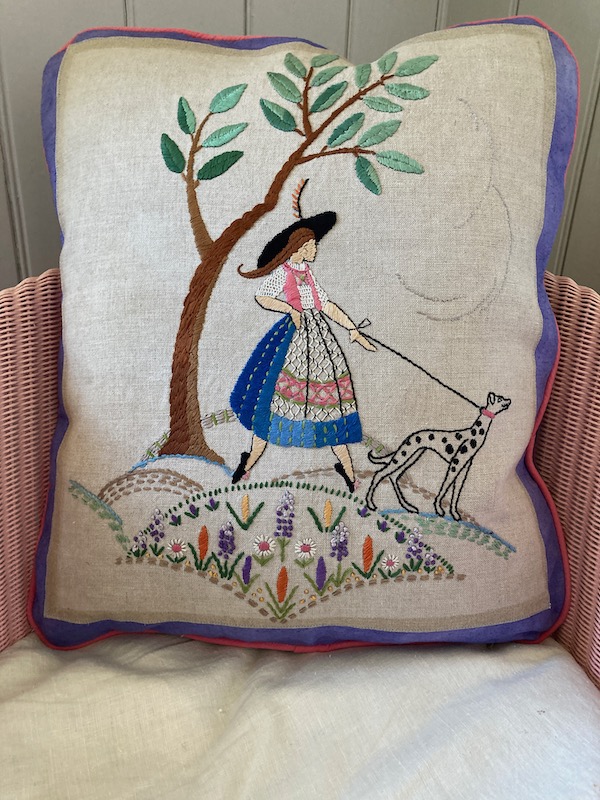 A 1930/40’s piece of silk embroidery on natural linen, made into a cushion by mounting the embroidery on a hand-dyed purple Métis linen and piping with a matching pink linen.