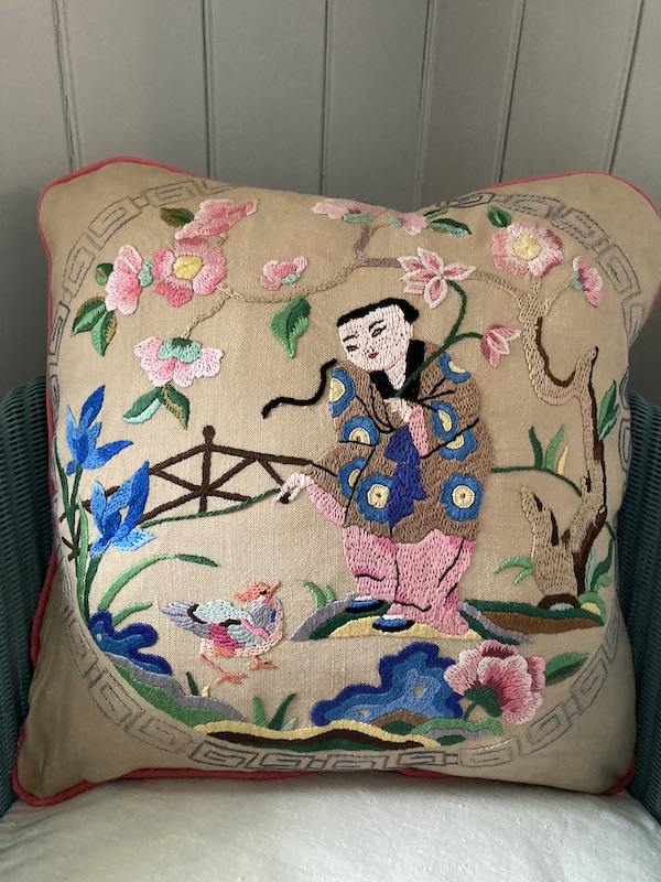 A panel showing a China Garden with a figure feeding an exotic bird surrounded by irises and a key pattern circular border – all embroidered on a fine wool.