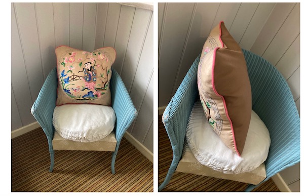 The completed cushion is piped with cerise pink linen and backed with a complementary soft light brown worsted wool.