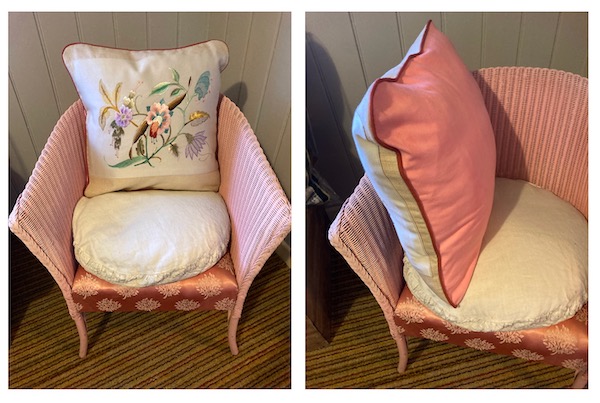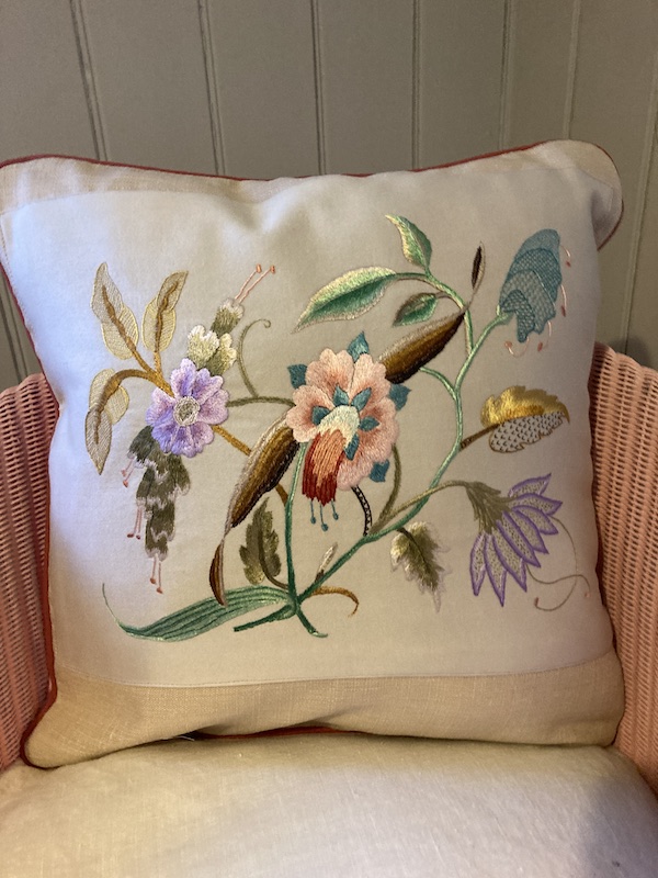 A delicate machine embroidered tree of life on cotton satin – mounted on a natural colour cotton and piped with a terracotta cotton. The back is a pink cotton twill.