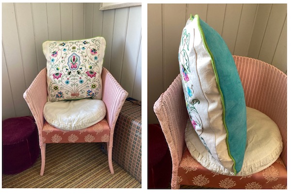 The panel has a lime green Métis linen piping with a turquoise blue hand-dyed Métis linen union back.