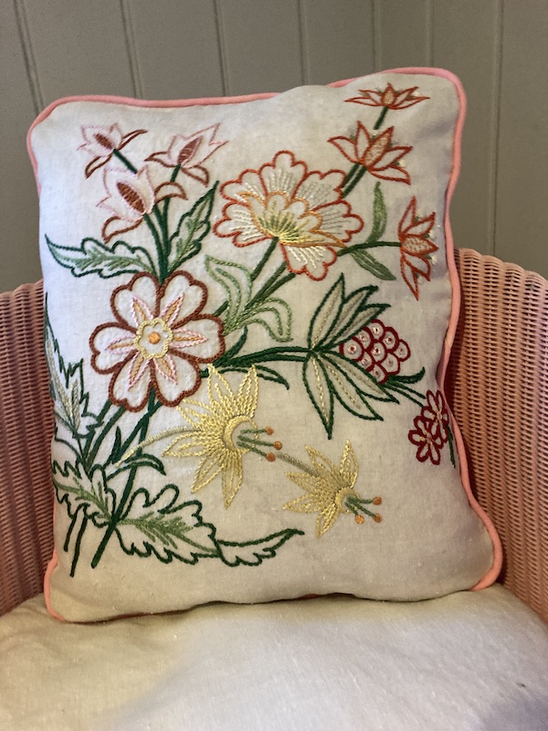 A 1940/50’s embroidery on linen with a light pink cotton twill piping and a hand-dyed tangerine twill back.