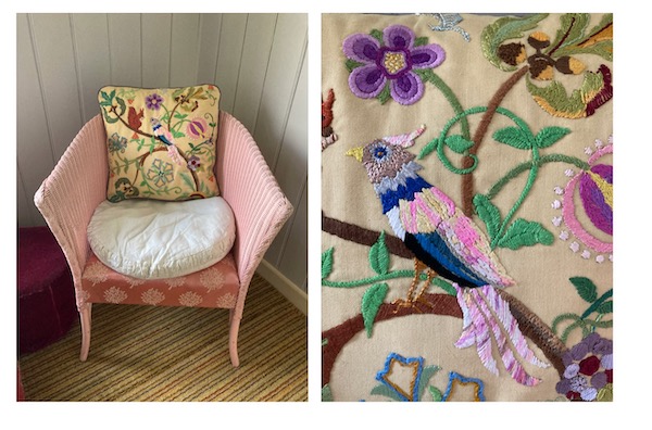 This vintage embroidery on a Naples yellow cotton was found unfinished and has been completed during the winter months on the beach at Dungeness ~ a perfect pastime for the stormy season!
