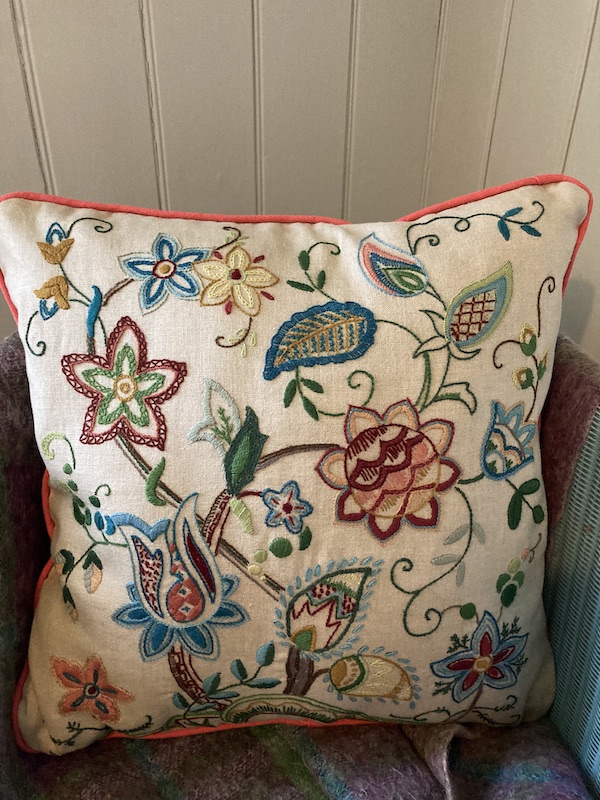 A 1930/40’s wool work crewel embroidery on a good quality natural linen with a natural linen back and a complementary coral hand-dyed rayon piping.