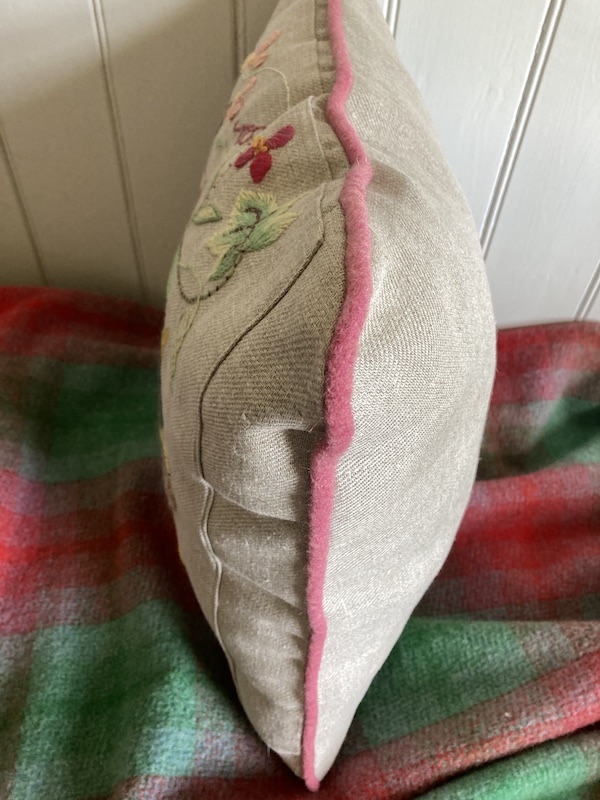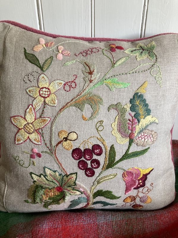 A contemporary piece of crewel embroidery on linen twill using a vintage design – the embroidery has been mounted and backed with the same natural coloured linen twill and piped with a hand-dyed dusky pink fluffy camel hair fabric.