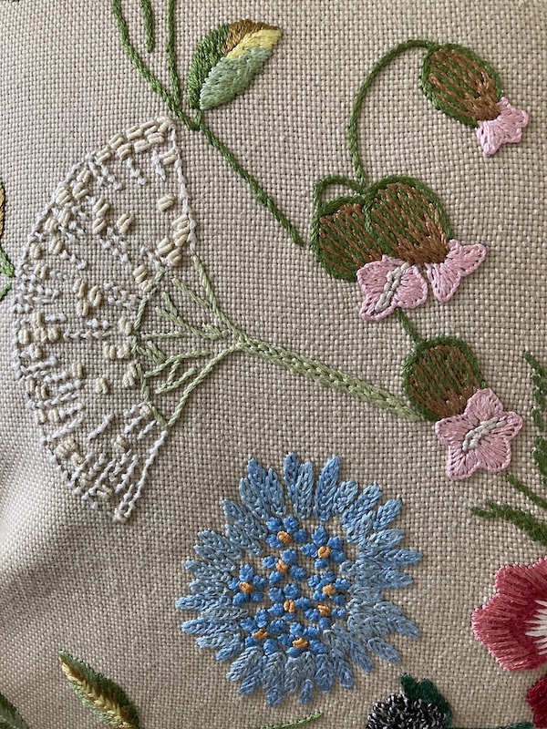 A detailed 1960/70s embroidery on s loose weave linen fabric. Embroidery includes anemones, allium and forget me nots – a mixed bunch of flowers and a mixed range of stitches.