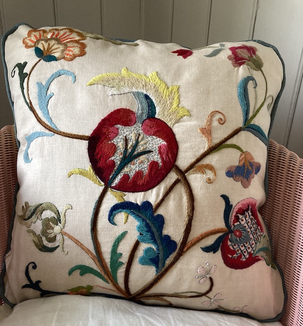 A Jacobean style contemporary crewel embroidery – worked in October ’25 with the colour reference from a sold cushion called Roma.