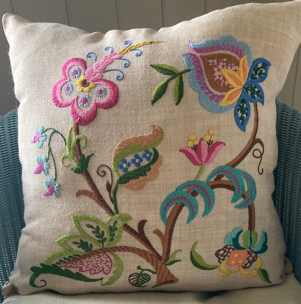 Probably hand embroidered in the Orient for tourists. The cushion is “as new” – still retaining its bright jewel-like colours.
