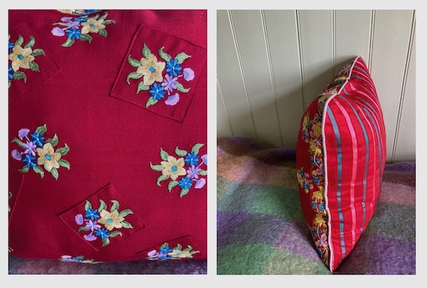 The cushion is piped with a lilac rayon fabric and backed with a red striped silk that echoes all the colours of the front.