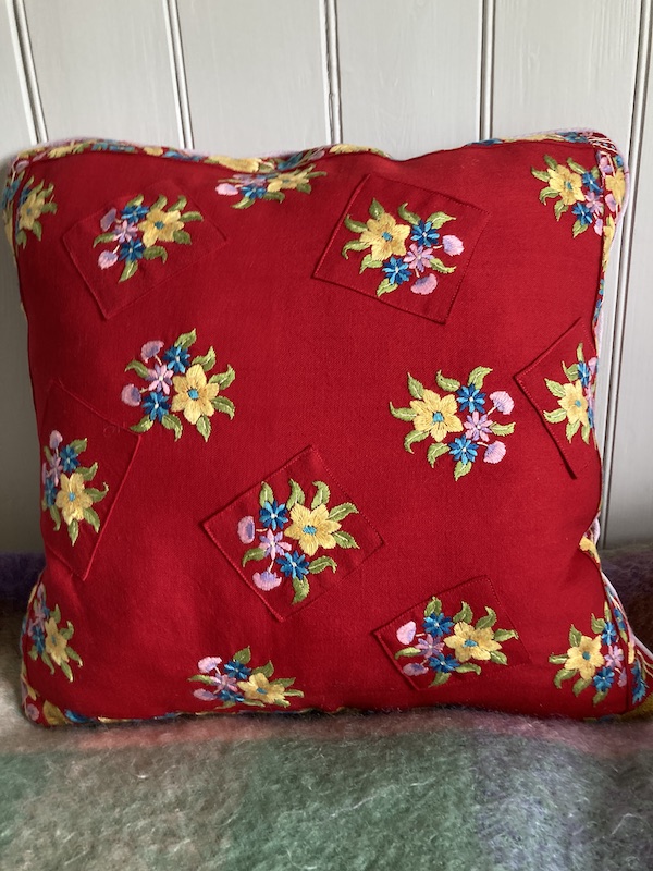 This gorgeous antique floral hand embroidery on a bright red fine wool has been repurposed and made into a stylish contemporary cushion.