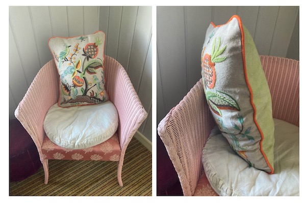 Embroidered on linen, the cushion is backed with a hand-dyed apple green Métis linen and piped with a bright orange vintage rayon.