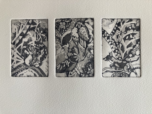 The Hare, The Crow and The Fox ~ a triptych of small etchings on the theme of Paradise and the Tree of Life.