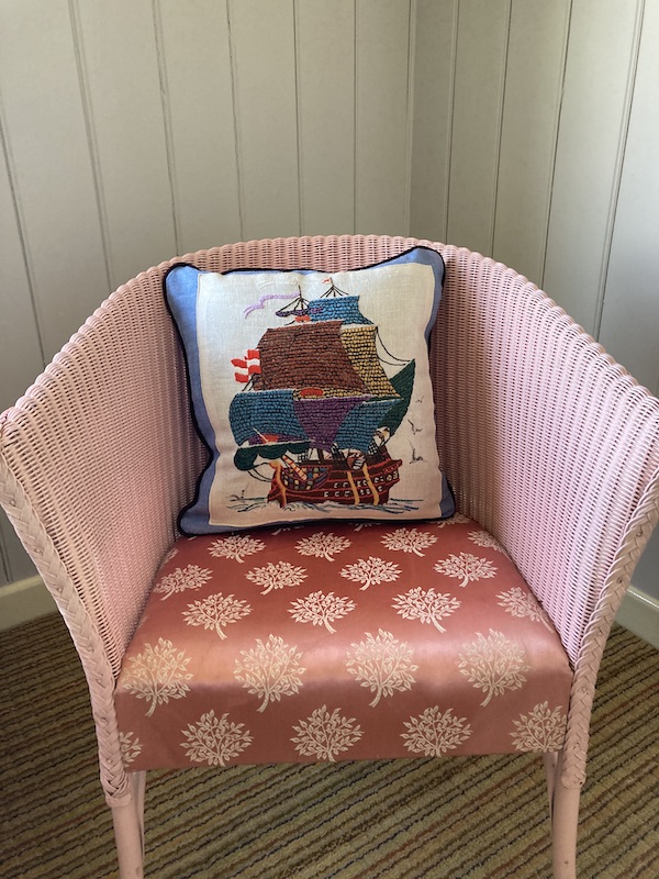 A chunky 1960’s embroidery of a galleon made into a cushion ~ mounted on a grey/blue linen with a wine coloured cotton piping and a cornflower blue Metis linen union back.